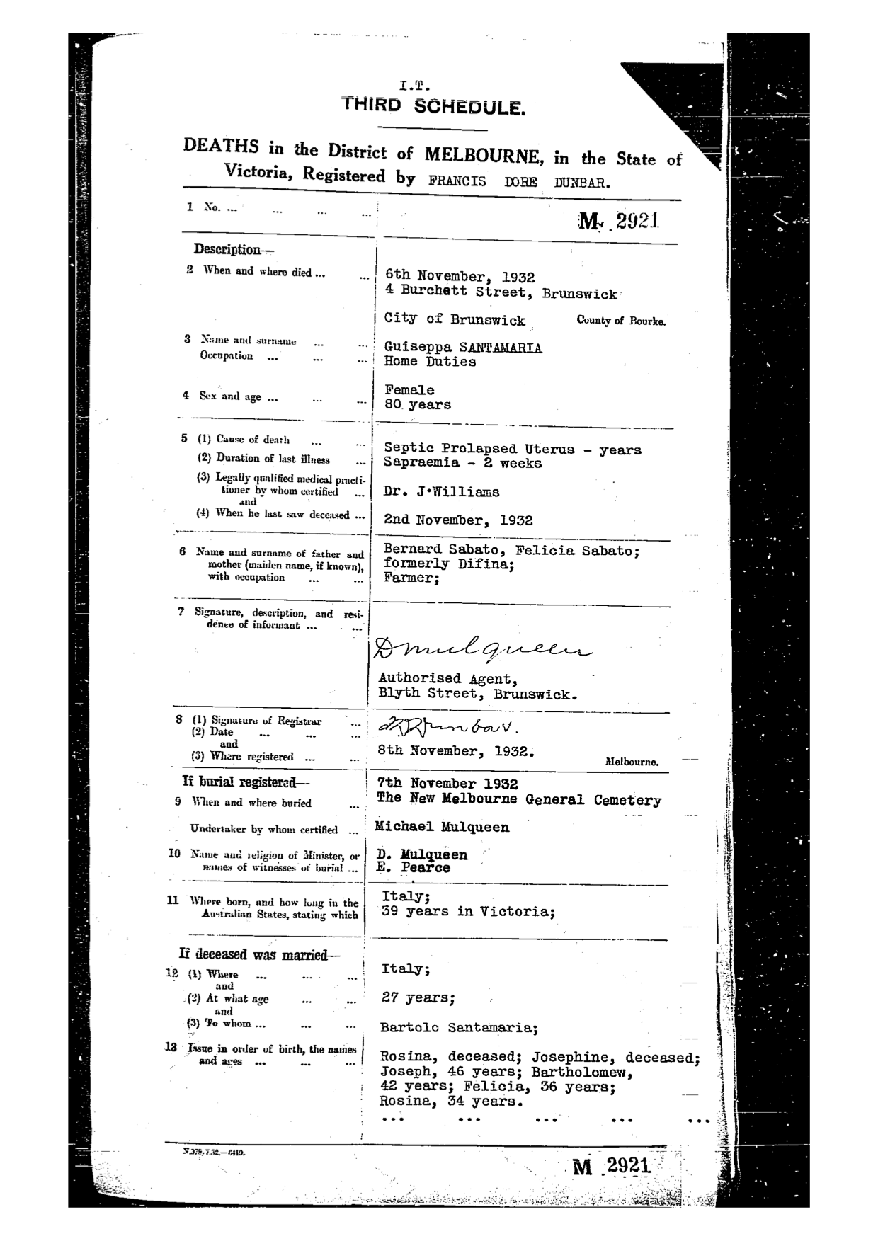 Giuseppa Sabato’s death certificate.