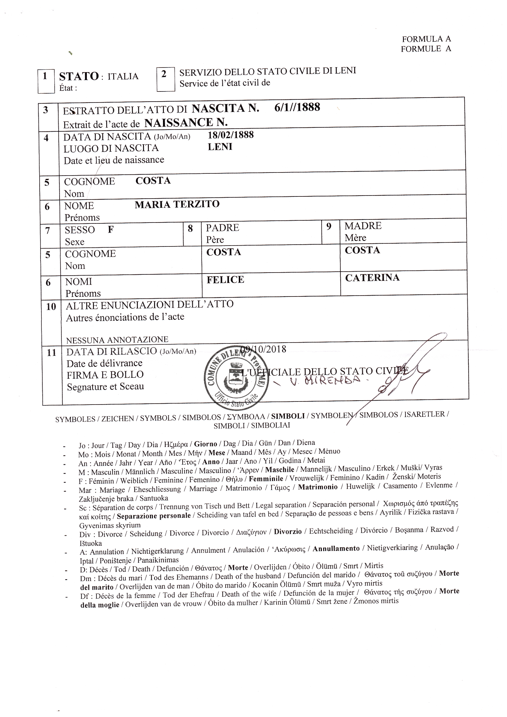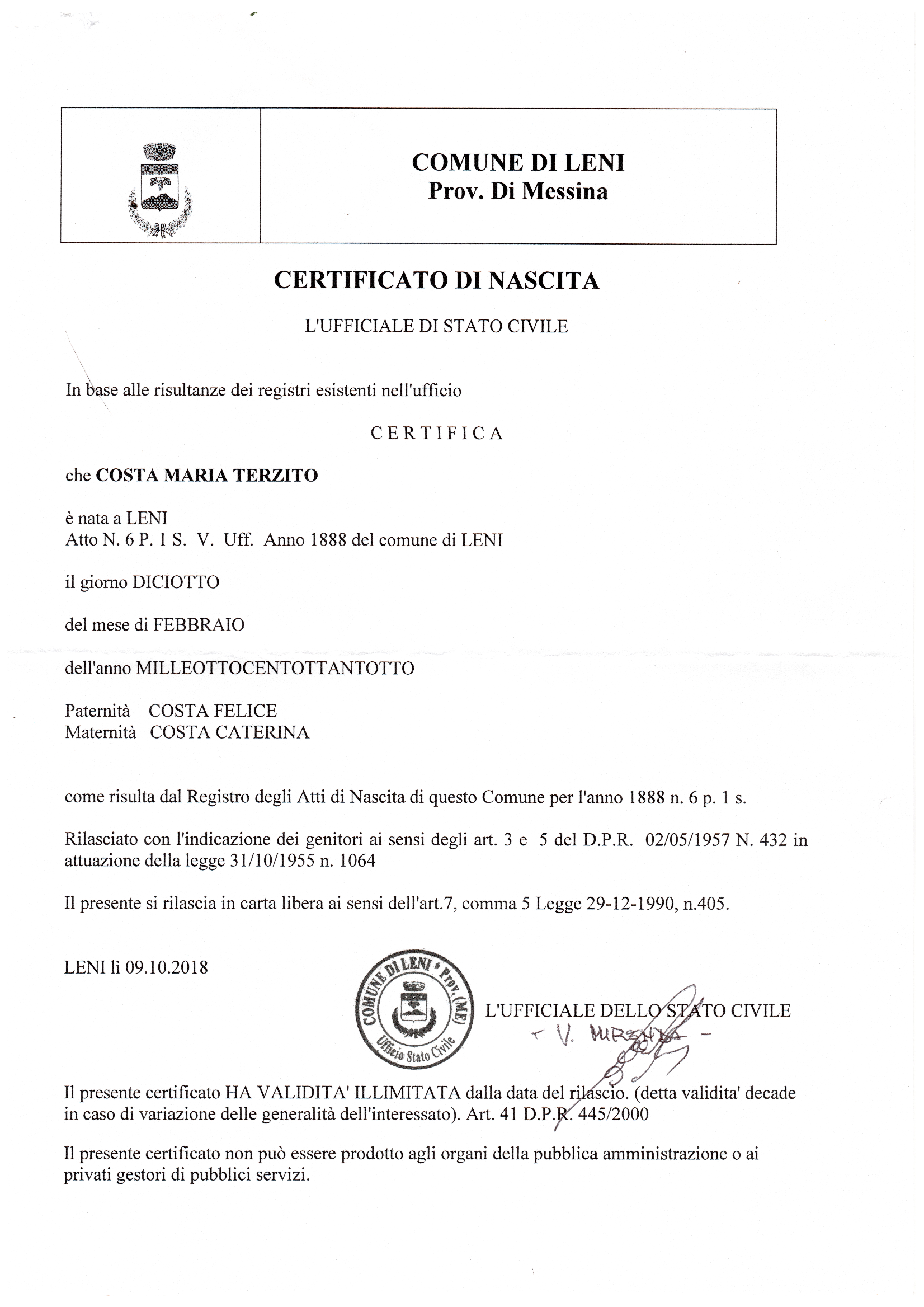 Official birth certificate of Maria Terzita COSTA, born 18/2/1888.